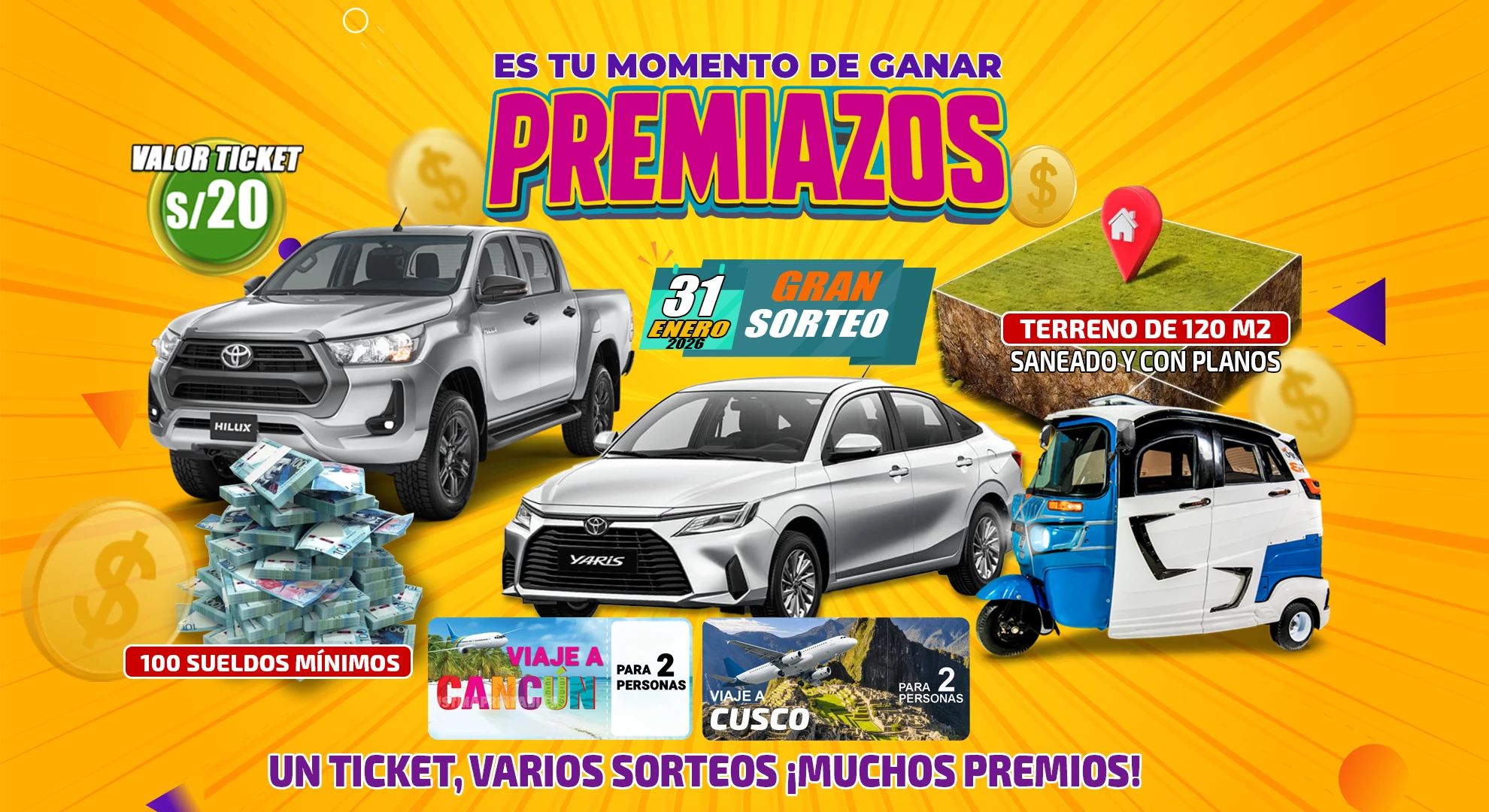 Una camioneta HILUX 4×4, un terreno en esquina de 120 m2, un Toyota Yaris, 100 sueldos mínimos, una moto torito 0KM, un viaje a Cancún para dos personas y un viaje a Cusco para dos personas.
